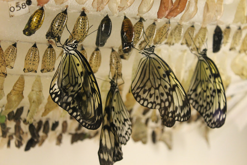 On finit cette rapide visite avec une "pouponnière" à papillons: une vitrine dans laquelle sont entreposées des chrysalides qui vont bientôt éclore. C'est très intéressant d'observer la variété des chrysallides: j'avais en tête que c'était un truc vert et visqueux ou marron et raccorni, mais il y en a de toutes les couleurs, et même certaines d'aspect métallique (d'ailleurs, le mot vient du grec khrusos qui signifie doré: j'aurai appris quelquechose, et vous par la même occasion!). Je n'ai pas vu de chrysalide éclore (je ne suis pas assez patiente), mais j'ai vu des papillons tout frais sortis: l'image du papillon qui soit sécher ses ailes n'est pas du tout usurpée: leurs ailes sont toutes froissées et il faut qu'ils prennent le temps bien les repasser.